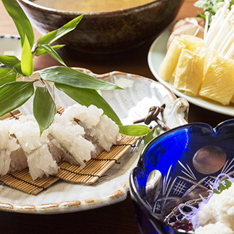 ハモは梅雨の時期に脂が増し美味しくなると言われます。瀬戸内海より鮮度の良いハモを骨切りし、ハモしゃぶ・ハモの落とし・ハモの柳川と…夏一番の味覚と言える鱧料理で会社のご接待、知人、友人との楽しい語らいにご利用下さいませ。