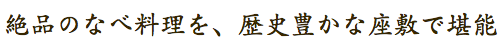 南座横の大和大路を少し下ったこの地で明治年間から営業し。京の野菜に鶏を添え、金のなべを用いましたところから屋号を「きんなべ」といいました。京都風情を残した和風建築で、中庭を通っての奥座敷。そこには竹のトクサ板張の天井や二枚羽根の扇風機などがそのまま往年の風格を伝え、お客様に落ちついた雰囲気でお食事をしていただけます。