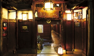 木戸から奥へ奥へと延びる通り庭には水打ちをし、清めてお客様をお迎え致します。大広間を含め全部で13ある部屋には、日本の伝統技法である網代天井や網代戸・壁などさまざまな意匠が凝らされ、歴史の長さを感じて頂けます。和紙の素晴らしさや、船底板を使用した天井、畳、床の間、中庭など京都のよさを、心ゆくまでご堪能ください。